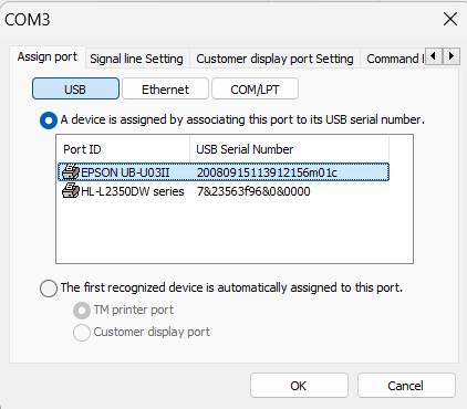 We recommend clicking on COM3, and then insuring you have selected USB in the additional screen that appears. When the setup recognizes the attached printer it should appear under Port ID. Click on the OK button.