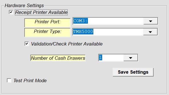 Ensure the Receipt Printer Available and Validation/Check Printer Available options are CHECKED.